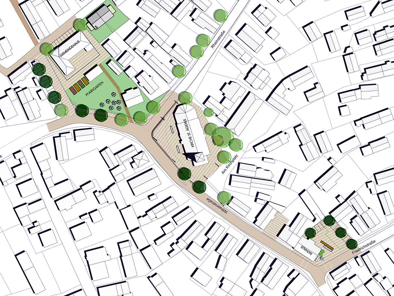 Das stark sanierungsbedürftige katholische Gemeindehaus in der Nordstraße soll abgerissen werden. An seiner Stelle könnte bei einer Einigung mit der katholischen Kirche ein Seniorenzentrum entstehen. Nach dem geplanten Umzug der Feuerwehr ins Gewerbegebiet soll der Platz hinter dem Rathaus zum neuen Dorftreffpunkt umgebaut werden. Die Fläche um die Kirche St. Ägidius wird ebenfalls mittels Stadtmobiliar und einem einheitlichen Bodenbelag attraktiv gestaltet.