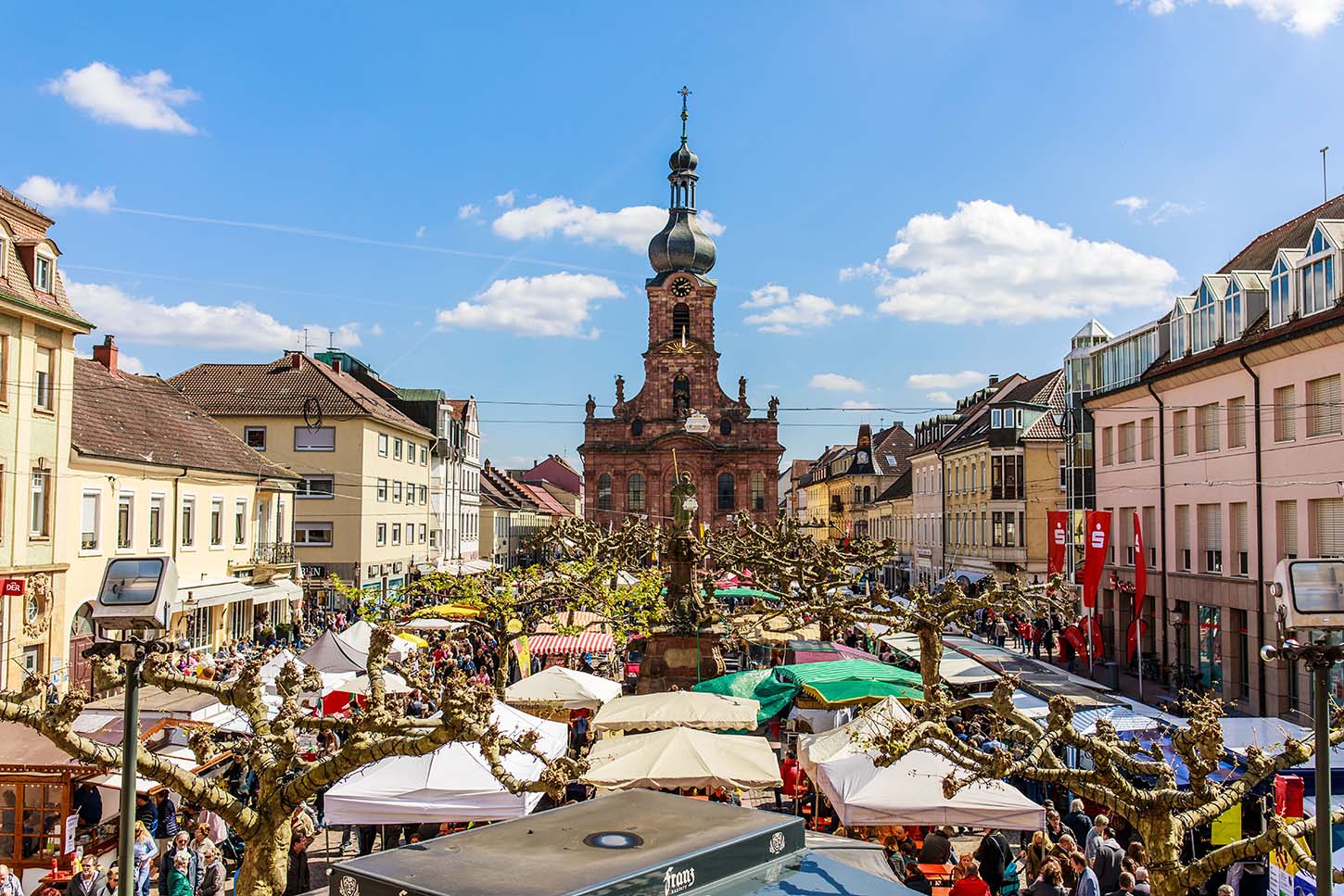 Frühlingsmarkt mit Ständen auf dem Marktplatz in Rastatt