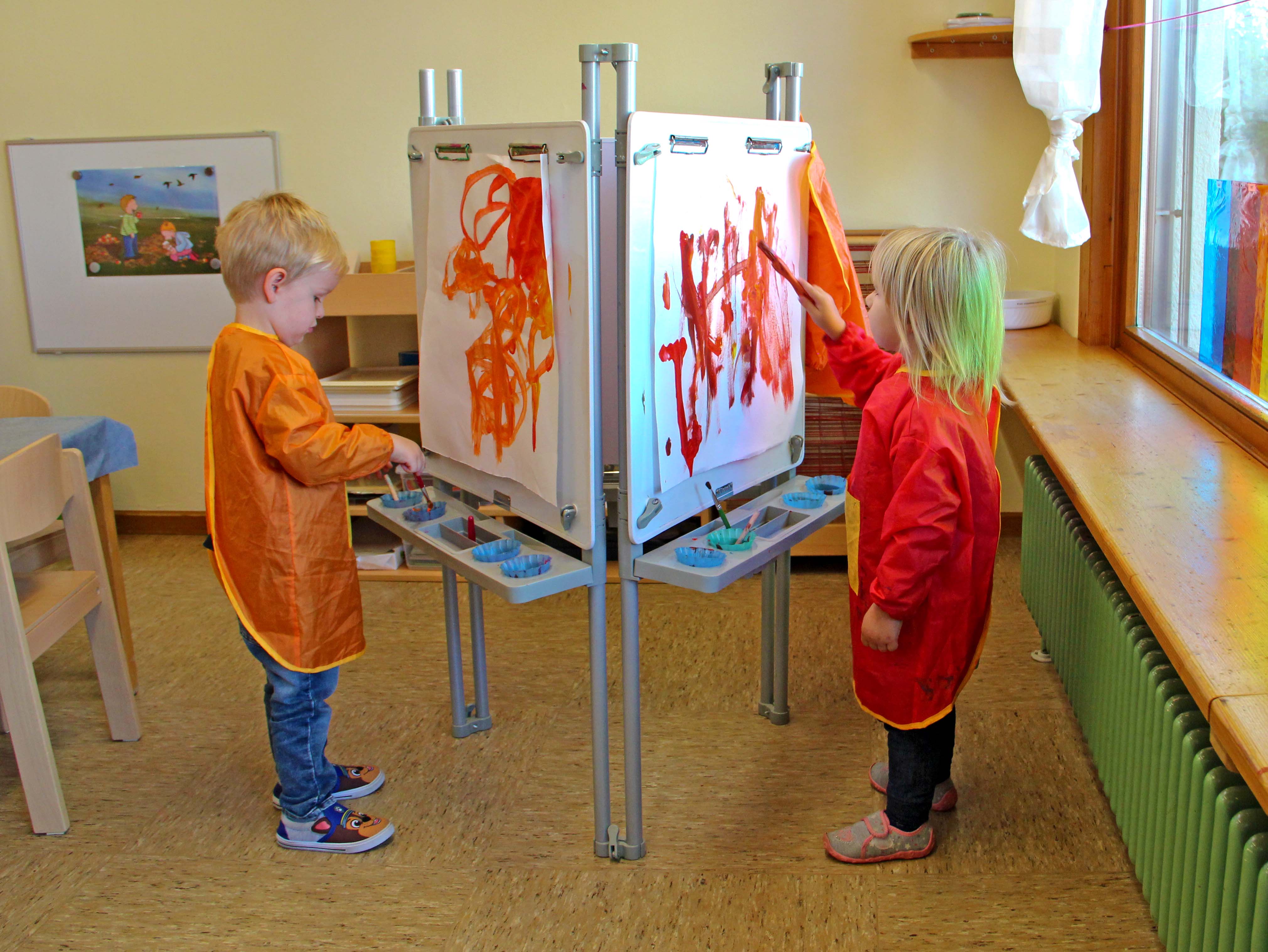 Malen, Zeichnen und Gestalten bedeutet für die Kinder sich kreativ auszuprobieren, Gefühle auszudrücken und Sinneserfahrungen zu sammeln. Die Kinder werden inspiriert eigene Ausdrucksformen zu finden, welche individuelle Werke ergeben. Das Auge schulen, Wahrnehmungen einordnen und verarbeiten, sowie mit Werkzeugen umgehen lernen – all das gehört zum künstlerischen Gestalten und verbessert die feinmotorischen Fähigkeiten.
