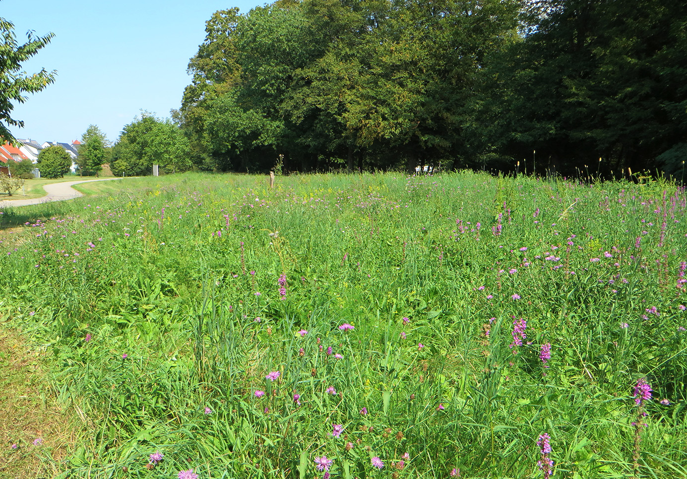 Wiesen sind menschengemacht. Ohne Pflege verschwindet die Blütenpracht. Gleichzeitig führt zu viel des Guten für mehr Gras auf der Fläche. Die richtige Mischung macht es also. Zur strukturellen Erhaltung der „Futterpflanzen“ für die Fledermaus wird der Wiesenbereich in der Grünanlage nur zweimal im Jahr gemäht. Hierzu wird das Mahdgut nach Trocknung von der Wiese abgeräumt. Das fördert die Aussamung der Wildblumenpflanzen und hält den unerwünschten Aufwuchs konkurrenzstarker Grasarten niedrig.