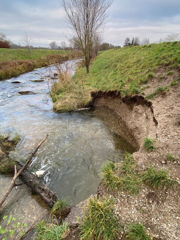 Der Feldweg entlang des Riedkanals, der die L77 mit der L78a verbindet, muss wegen einer abgerutschten Uferböschung in Höhe der Hofwaldschlut gesperrt werden. Gehölz hatte sich zuletzt an dieser Stelle verfangen und die Wasserströmung Richtung Böschung gelenkt.