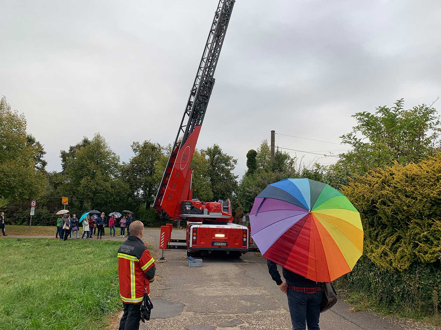 Mit der Drehleiter der Freiwilligen Feuerwehr Rastatt konnten die Teilnehmer des Bürgerspaziergangs von oben auf das Landesgartenschau-Gelände schauen. Foto: Stadt Rastatt/Isabelle Joyon